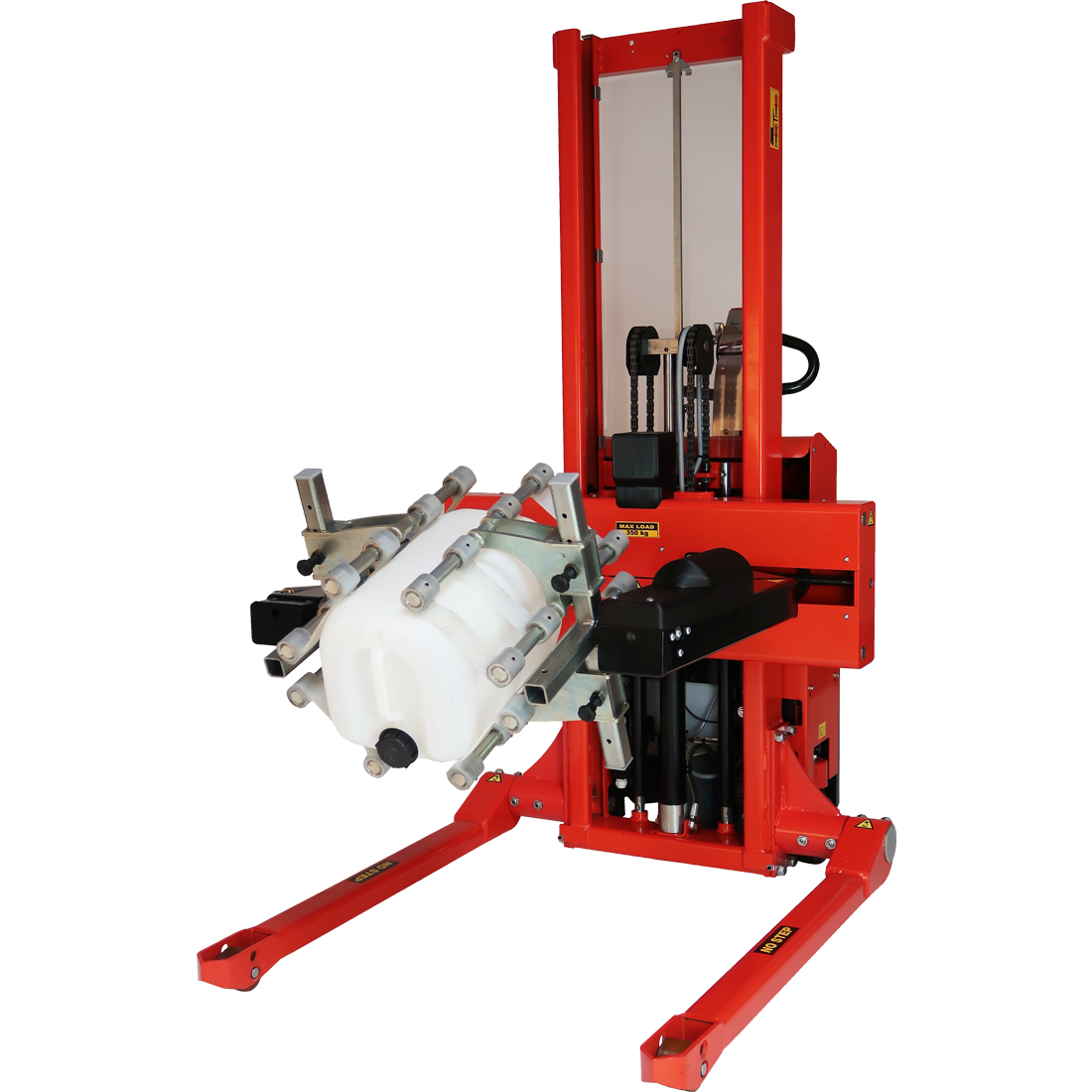Rotation and opening/closing of the gripping arms, and the lifting and lowering function, are electric. The Multi drum turner can be fitted on both the fully powered Logiflex and the electric Logiflex. Both models are available with straddle legs, if the drum e.g. is placed on a closed pallet.