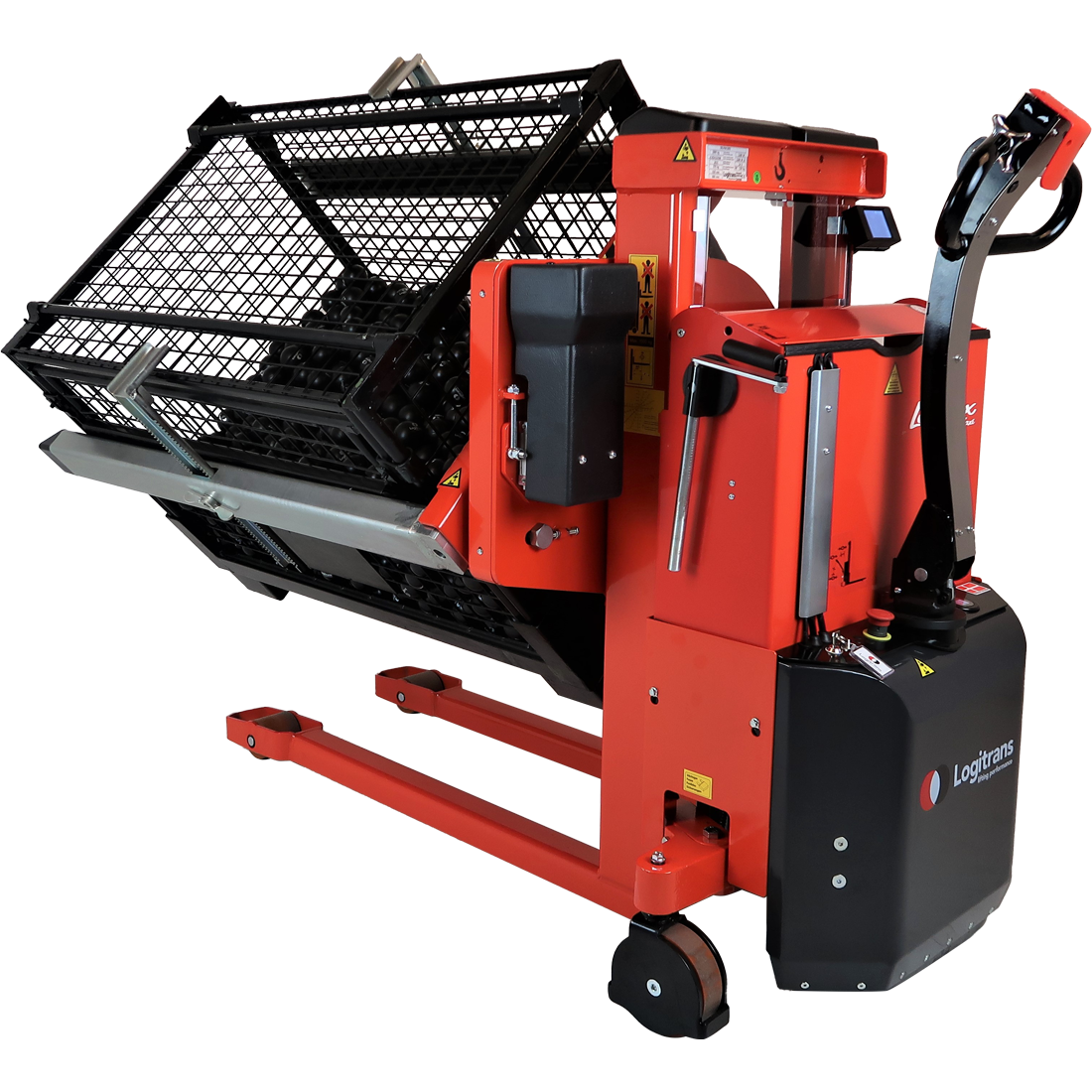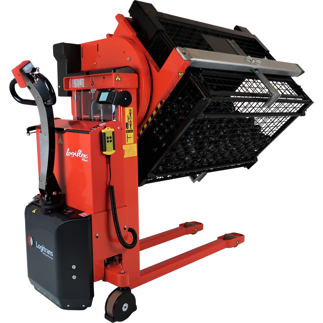 The Material Handling Rotator with adjustable box holders can tilt crates and boxes so that the user can reach the contents without stretching, bending and straining the back.