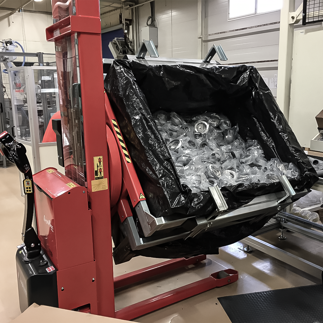 The Material Handling Rotator with non-adjustable box holders (box holders are optional extra) is the solution, if handling of different box widths is not required.